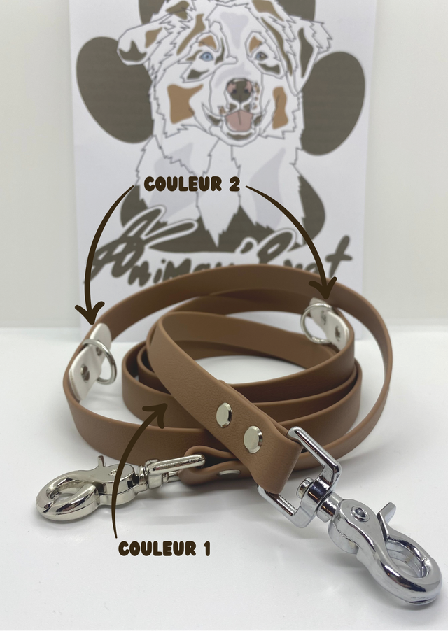 Offrez-vous une laisse 3 points. Fabriquée en biothane, elle mesure environ 2m60 de mousqueton à mousqueton. C'est la laisse qui est capable de s'adapter à toutes les situations de balades, en laisse longue au 1er anneau, en laisse bandoulière au 2ème anneau ou en laisse courte au 3ème anneau. Vous pourrez la personnaliser à vos goûts en choisissant 2 couleurs de biothane.